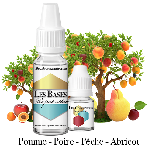 Un mix de fruits du verger : Pomme Abricot Poire Pêche. Délicieusement doux et fruité, à vaper toute la journée. Taux de MPGV/VG au choix : 70/30 ou 50/50. Nouveauté, vous pouvez maintenant choisir aussi l’intensité de saveur ! Retrouvez-ici toutes nos saveurs fruitées