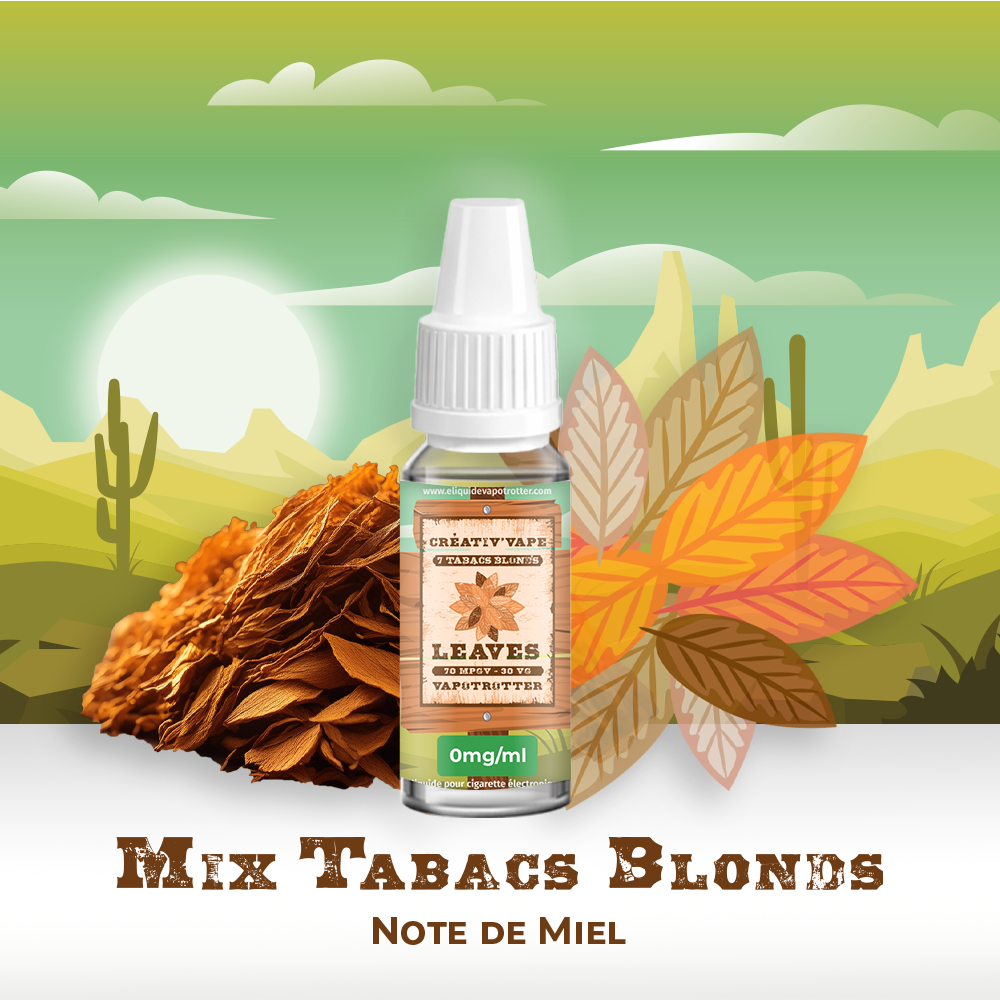 Découvrez l’e-liquide Leaves, un Mix Tabacs Blonds Miel de Créativ’Vape, une alliance harmonieuse de tabacs blonds arrondie par une douce note de miel.